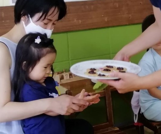 おやつはみどり幼稚園お手製のブラックベリーのジャムをのせたクラッカー。