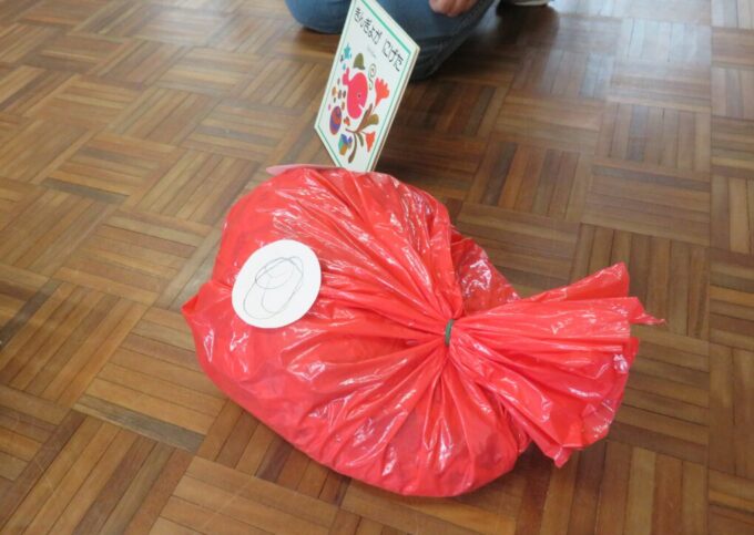 雪遊びの後は、赤いふくろに入れてお片付け。