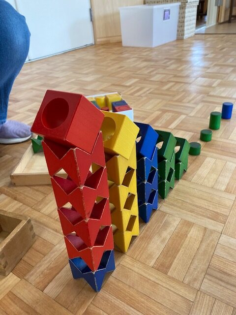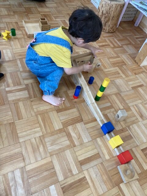 木のおもちゃを組み合わせて、ビー玉転がしで楽しんでもらえたら…と思って、