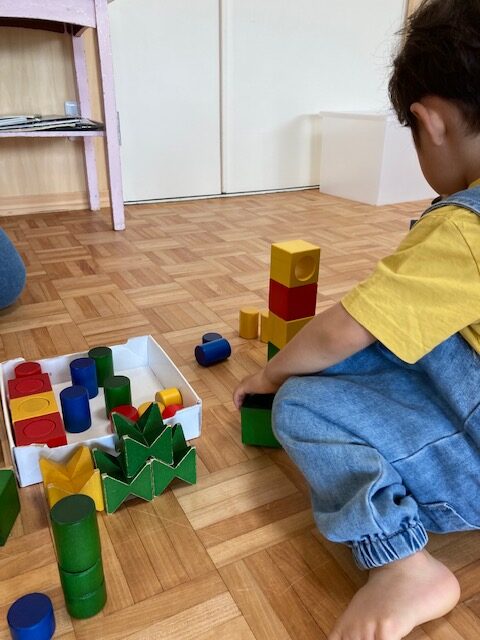 穴あきの積み木をトンネルに見立てて置いたりと色んなあそびになって、楽しかったね。