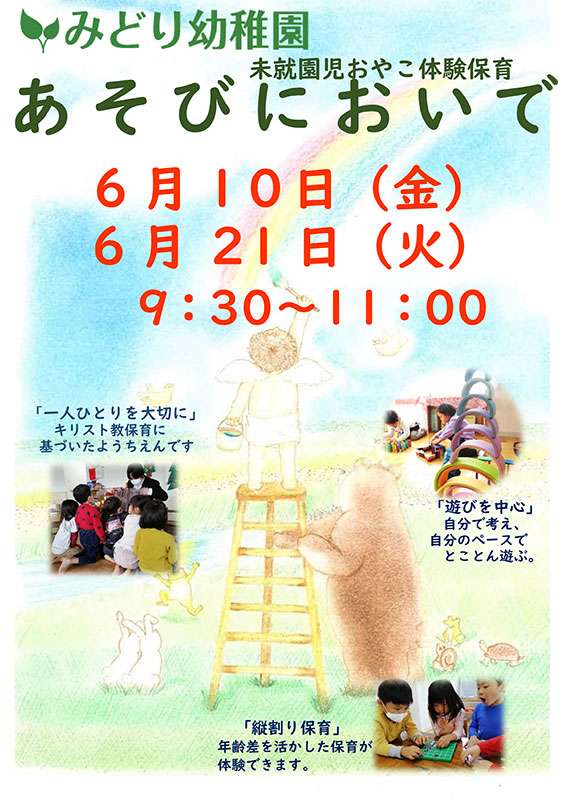 未就園児おやこ対象の体験保育「あそびにおいでよ&入園説明会」のお知らせです。