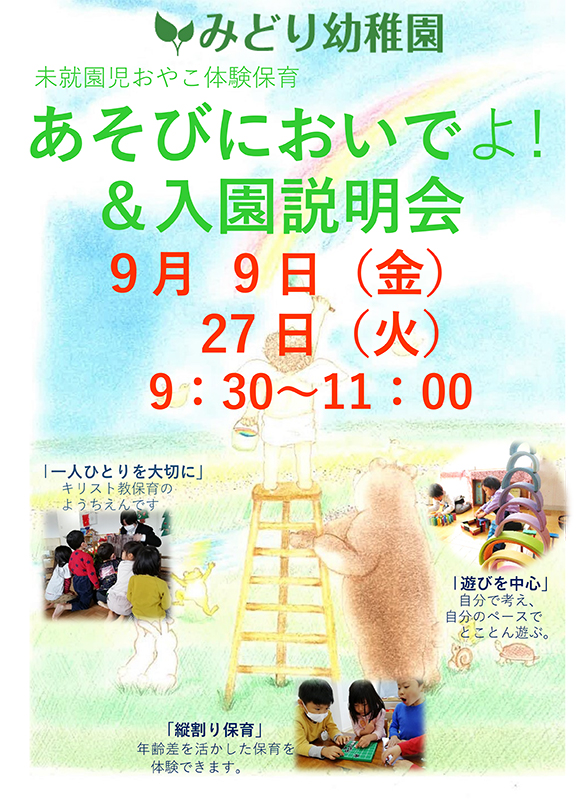 みどりオープンday 2022 11/11 お知らせ お知らせ 未就園児おやこ対象の体験保育「あそびにおいでよ」&「入園説明会」9月のご案内 みどりサポーターズクラブ会報創刊号発行のお知らせ 関連記事 あそびにおいでよ〜体験保育と入園説明会〜 2025年8月19日 みどり幼稚園の保育体験 2025年5月8日 おやこで楽しく過ごせる体験保育・入園説明会のお知らせ 2024年8月22日 おやこで楽しく過ごせる体験保育のお知らせ 2024年5月27日 ももグループ「小さな秋の音楽会」のお知らせ 2023年9月29日 みどり幼稚園に、あそびにおいでよ! 2023年9月4日 みどり幼稚園に、遊びにおいでよ! 2023年5月19日 みどりサポーターズクラブ会報創刊号発行のお知らせ 2022年12月20日