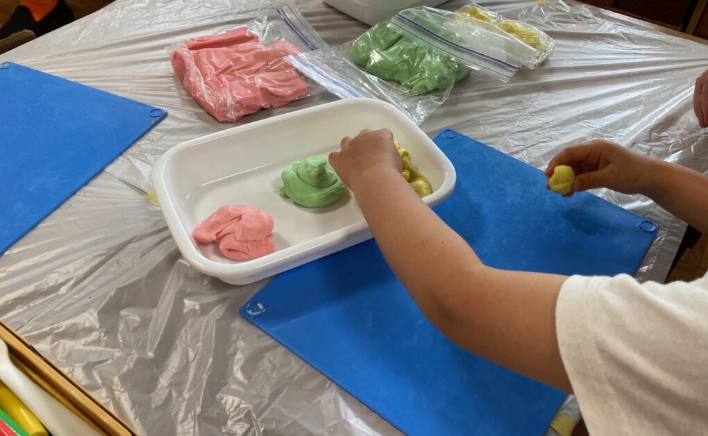 今日は、小麦粉と塩と食紅で作った小麦粉ねんどで遊んでみましたよ。