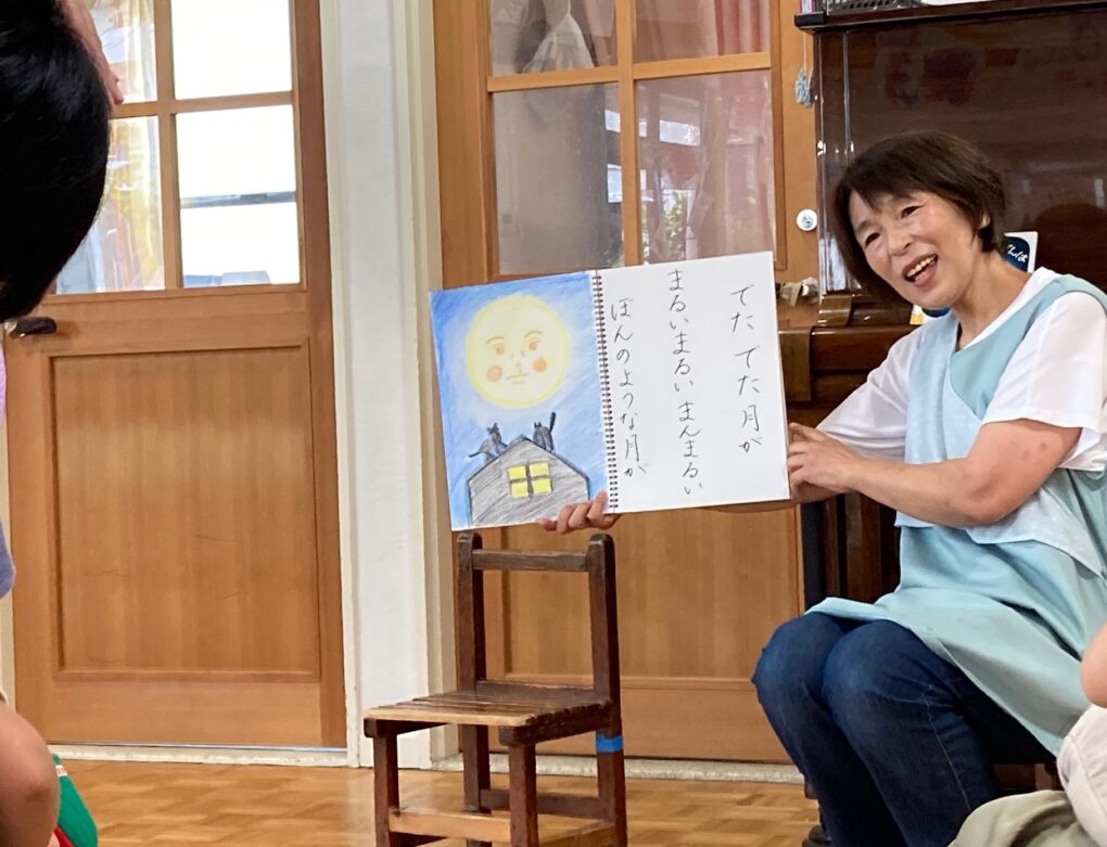 まんまるお月さんに近寄って会いに行ったお友だちに「まんげつ、見たよ」と教えてくれたお友だち。