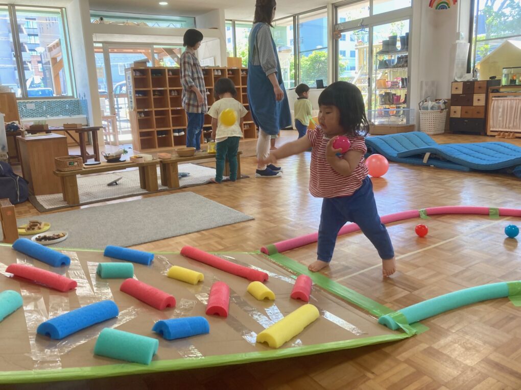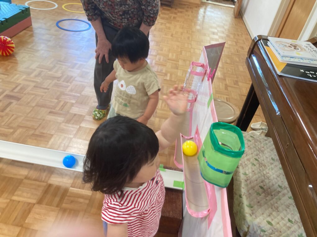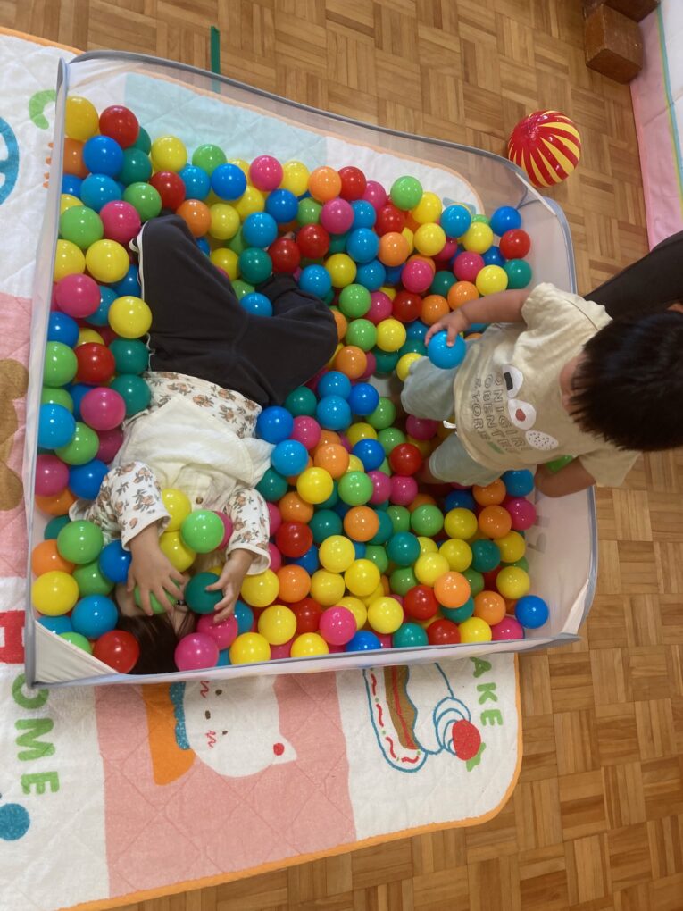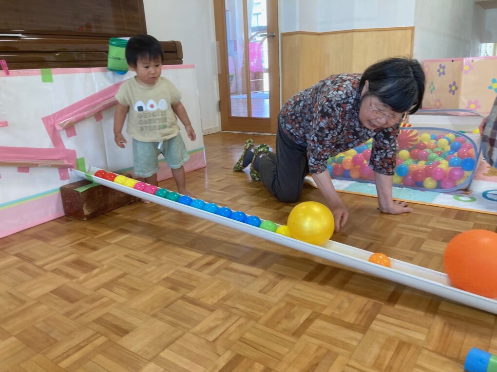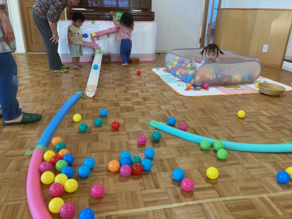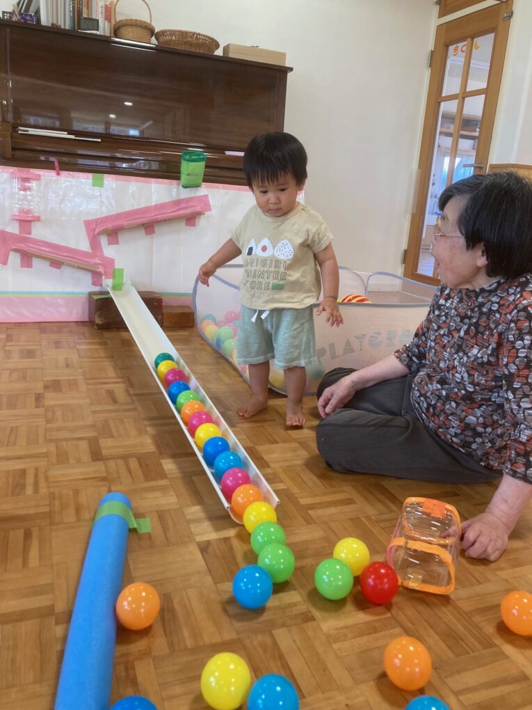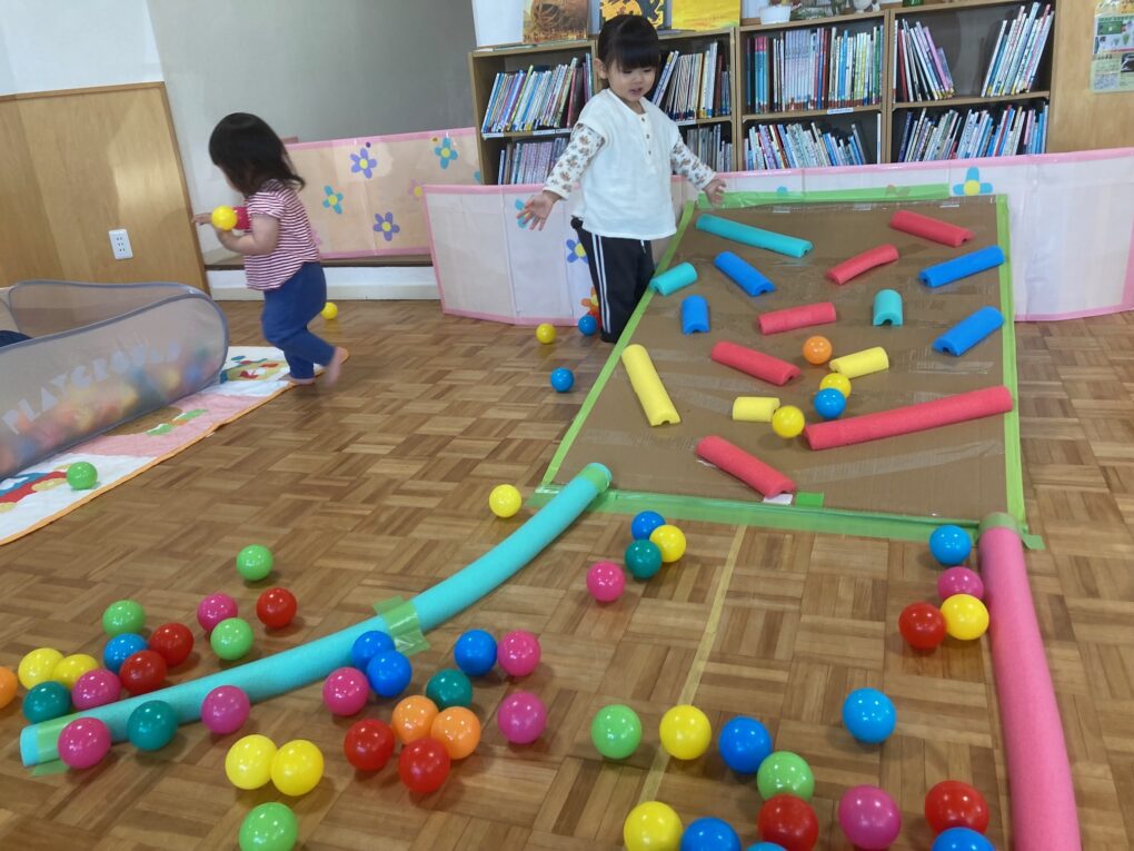 カラーボールを転がしたり、投げたり、坂道コロコロを楽しんだよ!