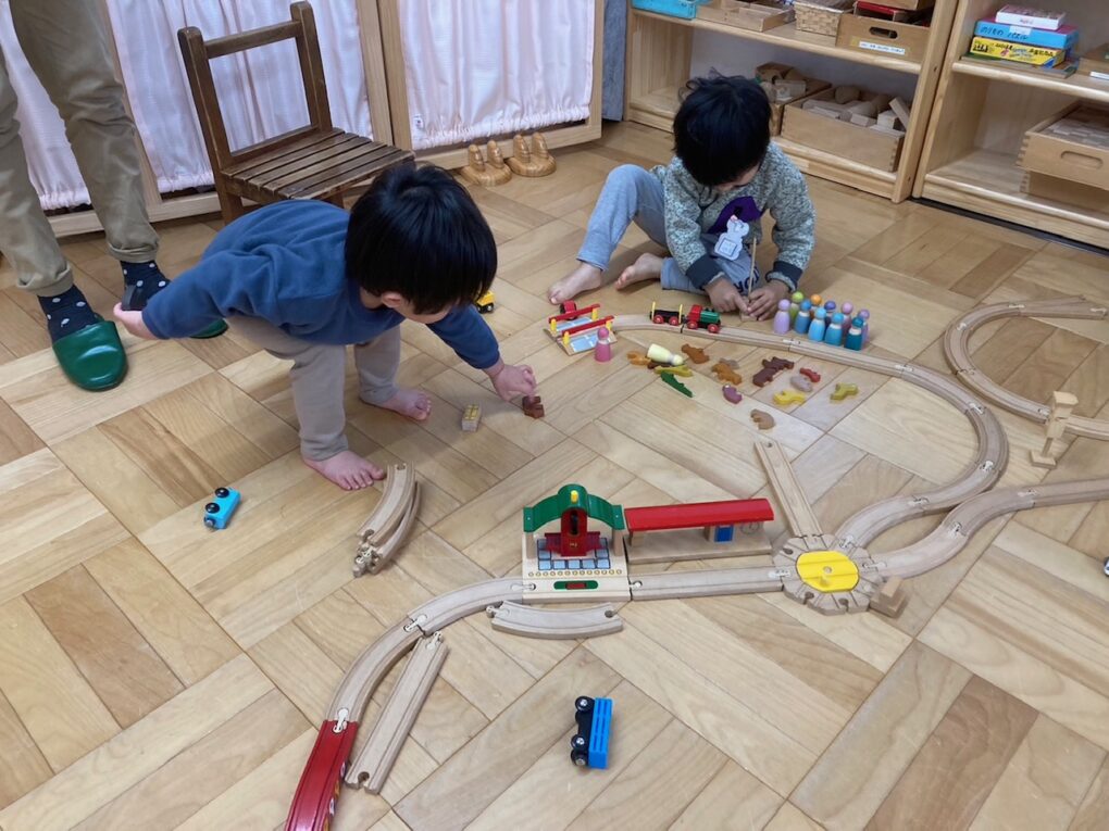 自分でどんどん線路を繋げたよ。見てみて。こんなに大きく繋がった。 動物さん達もいっぱい。 「これはヘビさんだよ。」とおともだち。 寝返りができるようになったんだ!!スクスク大きくなってるね!! 今日は、和子先生手作りの影絵で、クリスマスのお... -