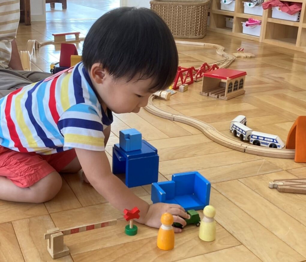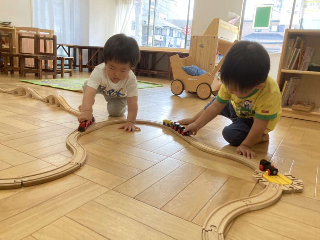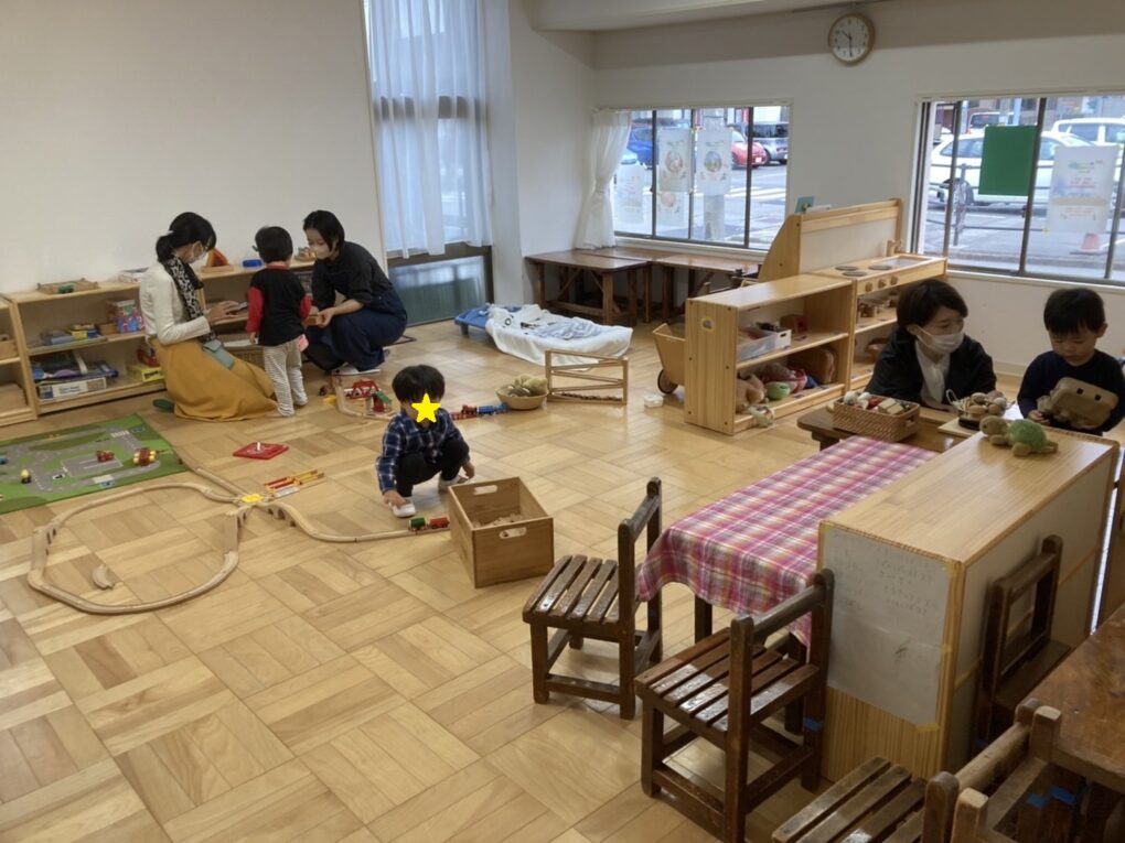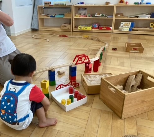 線路を高くするために重ねた積み木に穴が開いている。 あれ?丸い積み木が入るぞ!おもしろい! しばしの間、電車遊びより夢中になっていました。 う~ん・・これは難しいぞー ママと一緒に頑張るお友だち。 すてきな車ができた!! ハイ、ポーズ! 今日...