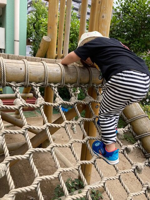 今日はお庭遊び!! 丸太の階段、よっこらしょ。上まで登れたよ!!やったぁ!! さあ、次は網の坂道だ。後ろ向きになって慎重に‥慎重に‥。 お兄ちゃん達が登るのを見て、僕も頑張ってやってみたよ!! イチゴのアイスクリーム屋さんだよー!! ぱっぱを、... -