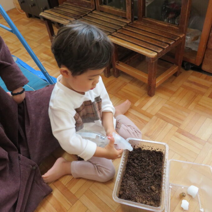幼稚園のお友だちがお世話しているかぶとむしの幼虫に興味津々 霧吹きで上手に幼虫のために土を湿らせてくれました。 絵本でも幼虫からかぶとむしになるまでを見て、「かぶとむし」って教えてくれました。 今日もおいしいお食事を作ってくれました! ひと... -